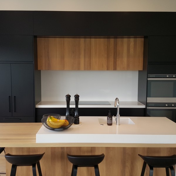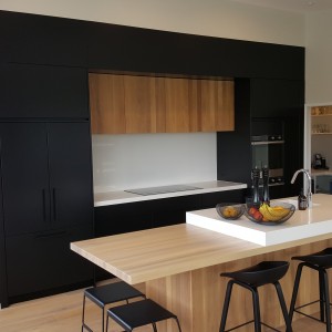 A key feature of this design was to have the straight flat line running from the window wall across to the pantry door, and the kitchen was to be recessed into the void. The dark colour palette and contrasting timber accents have added an impressive dramatic element to the scheme.